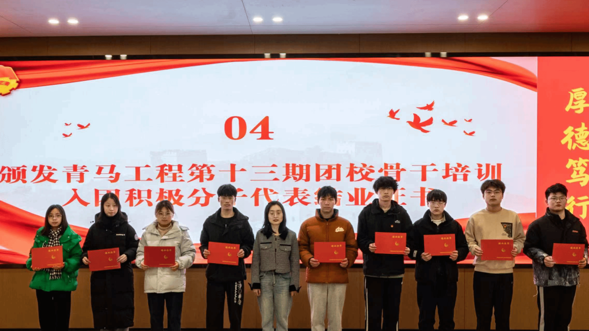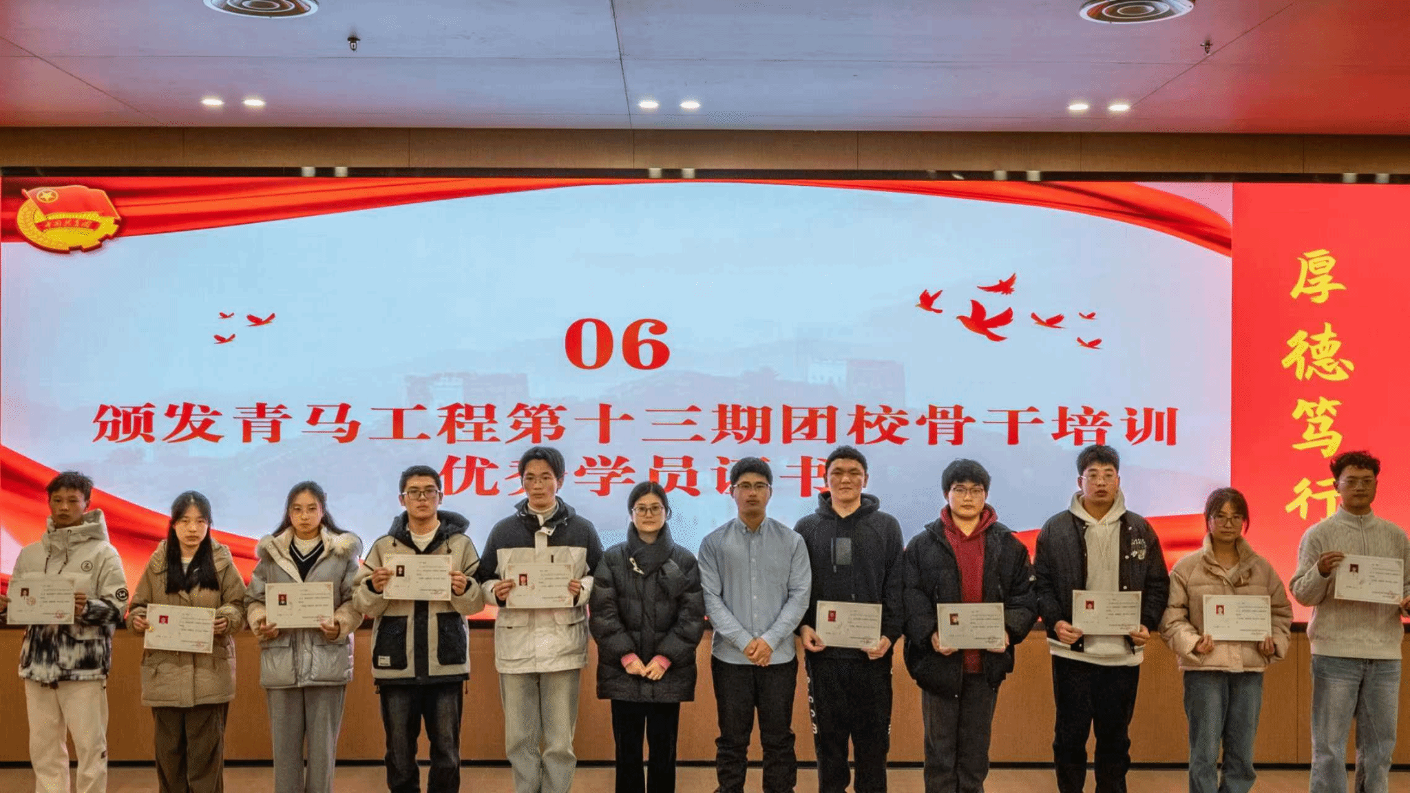 随后,团建中心指导老师奉明明宣读了本期团课骨干培训的学员结业名单,并由天游ty8线路1线路2检测中心团委书记何蕊芯为入团积极分子颁发结业证书;团校班主任周瑾则宣读了优秀学员名单,四位老师共同为他们颁发了优秀学员证书及团徽,以表彰他们在培训期间的卓越表现和积极贡献。