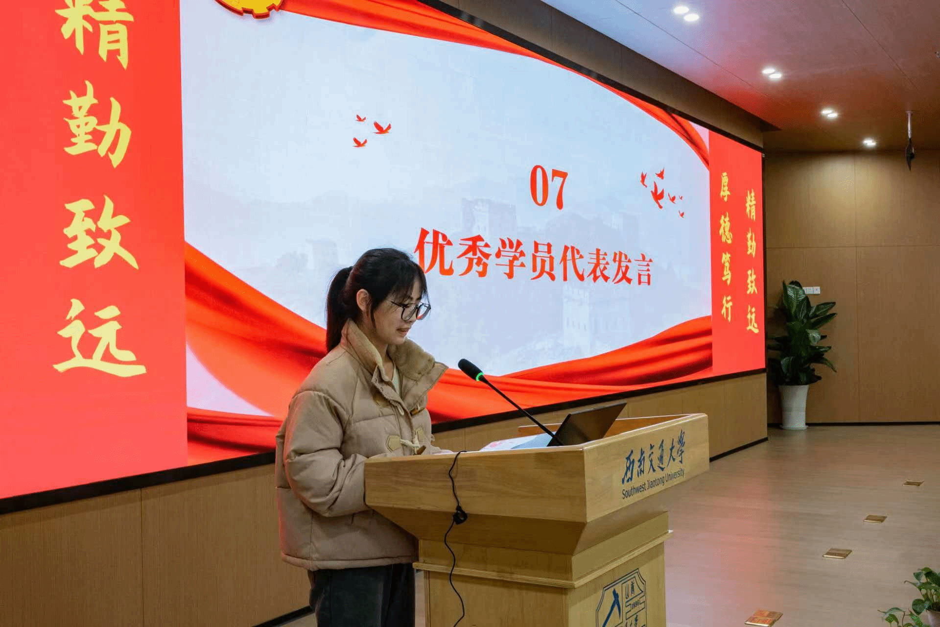 优秀学员代表刘雨朵在会上发表了热情洋溢的讲话,她分享了自己在团课学习与实践中的经历与感悟、思考与收获,激励着在场的每一位青年学子不断前行、追求卓越。在她的发言中,与会人员仿佛感受到了青春的力量与奋斗的意义,更加坚定了自身的理想信念。